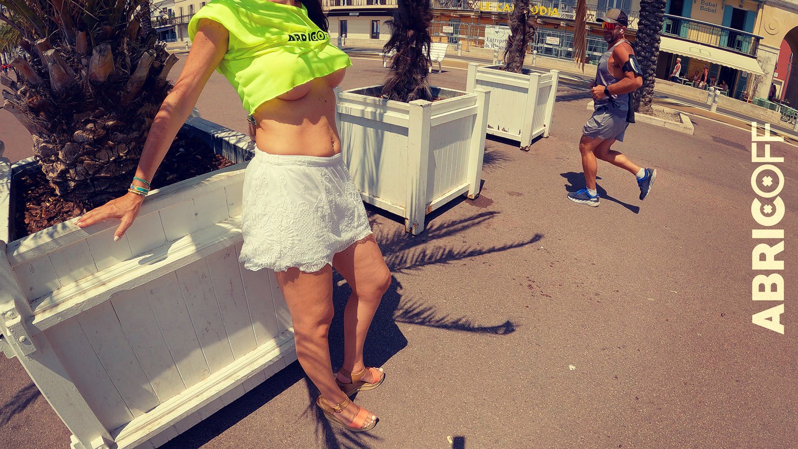 Tu te rappelles de la dernière fois sur la promenade des Anglais? Là où tu peux te poser avec la vue de la mer? Ouais, ben figure-toi qu’une femme exhib s’est pointée et là, bam, elle a mis le feu! Elle débarque avec son crop top jaune, genre bien flashy Abricoff. Sérieux, le truc était taillé pile poil pour elle, et tu voyais le bas de ses nichons en mode underboob, un truc de fou! C’était pas juste pour le show, tu sentais que c’était son style de coquine, elle aimait ça.
